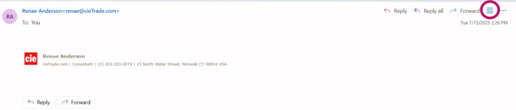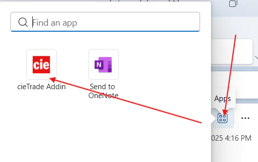 Click on an email, and click the Apps icon. Once installed, you should see the cieTrade Addin in your menu. Click on the icon to open the task bar.