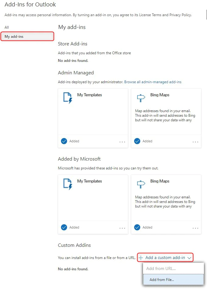 3. In the Add-Ins for Outlook page, click My add-ins on the left panel, then scroll to the bottom and within Custom Addins, click Add a custom add-in. From this drop down,