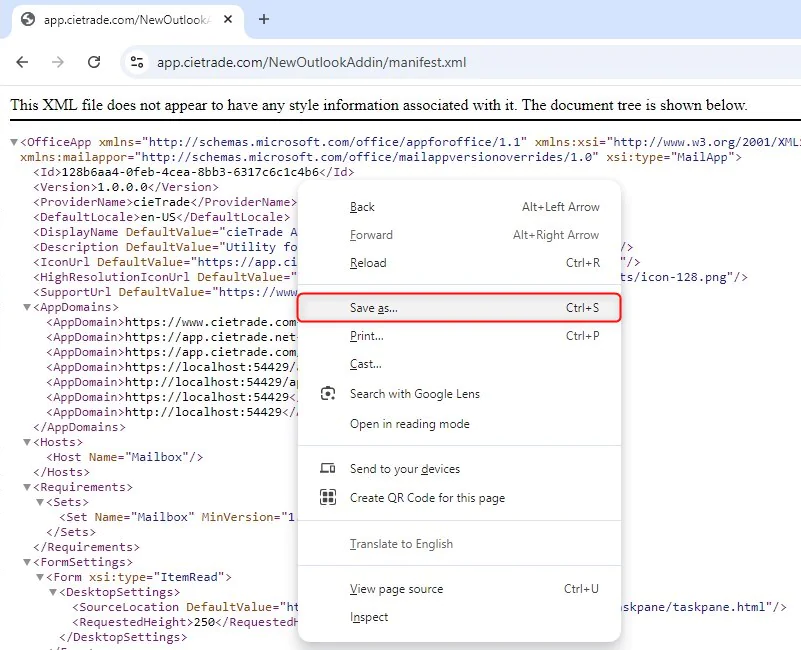 If your account type doesn’t support adding the add-in from URL, before selecting Add from File…, click this link https://app.cietrade.com/NewOutlookAddin/manifest.xml and within the page that it opens in, right-click anywhere in the page, select Save As… and save the file to a preferred location/folder on your machine.