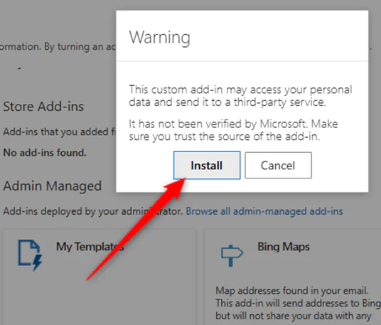 You may receive a warning saying that this is a custom add-in not verified by Microsoft. If so, click Install to continue.